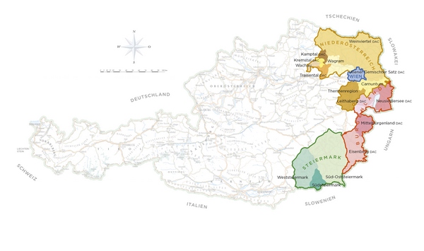 Австрийские федеральные штаты определяют винодельческие зоны. Это Нижняя Австрия (~30 тысяч гектаров), Бургенланд (~14 тысяч гектаров) и Штирия (~4,5 тысяч гектаров). Внутри них выделены 16 винодельческих регионов, включая Вену (~600 гектаров).