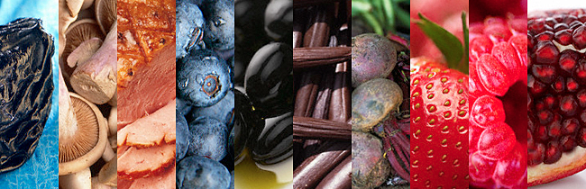 Фруктовые и овощные тона: : красная и черная вишня, малина, клубника, слива, чернослив, гранат, цитрус, ежевика, красная смородина, свекла, фенхель, олива.